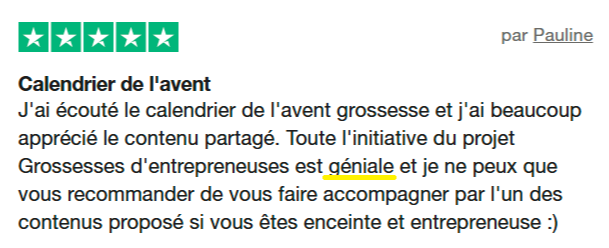 - Enfin, j'espère bien que tu ne t'arrêteras pas en si bon chemin 😉. Le Calendrier est là pour t'aider à défricher le complexe sujet qui t'attends, et te présenter ma méthode en détail. C'est aussi l'occasion pour toi de tester la façon dont j'explique les choses, et ainsi pouvoir être rassurée avant de rejoindre la Préparation Business à la Grossesse si le cœur t'en dit ! (D'ailleurs je prévois des bonus si tu passes le pas dans les 30 jours qui suit ton inscription au Calendrier).